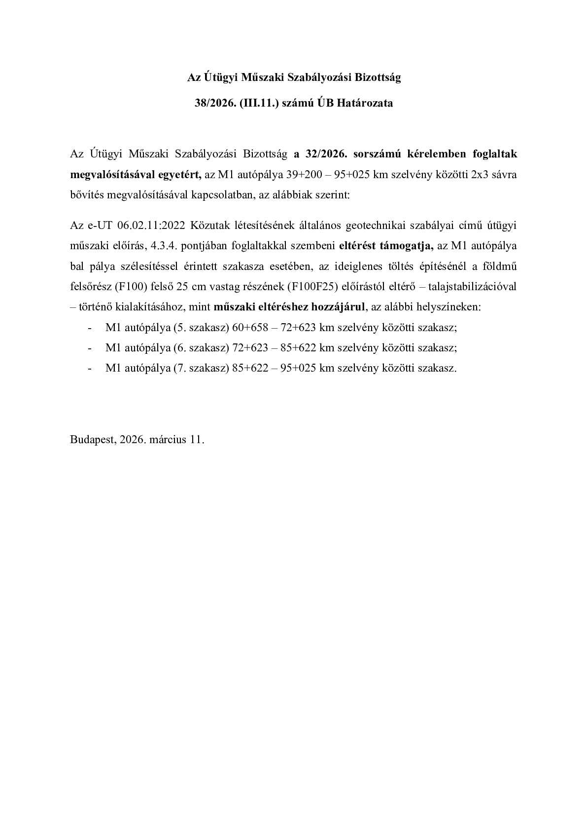 38/2026. (III.11.) ÚB határozat - M1 autópálya 39+200 – 95+025 km szelvény közötti 2x3 sávra bővítés megvalósítása