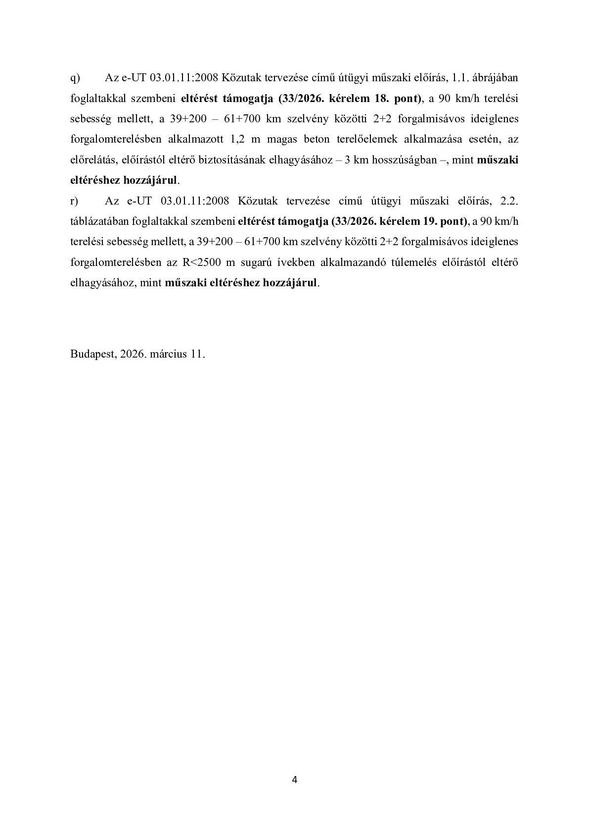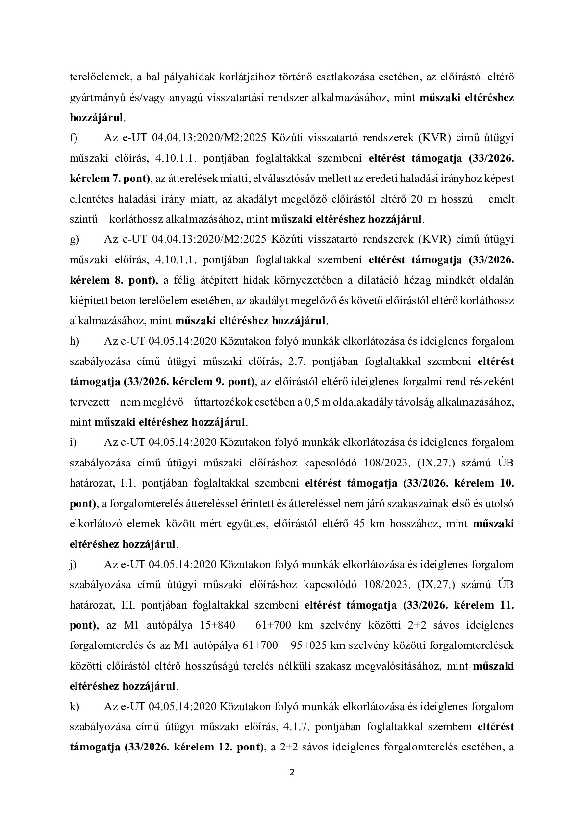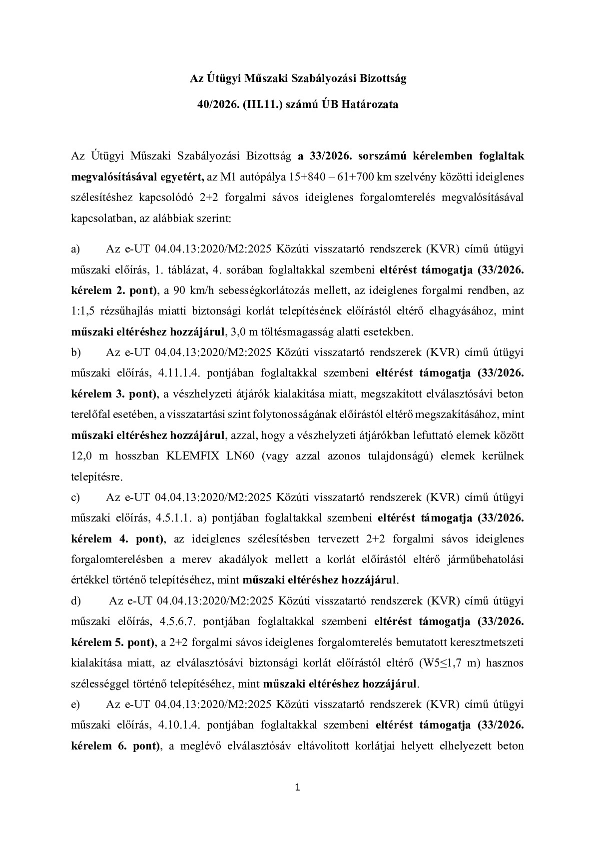 40/2026. (III.11.) ÚB határozat - M1 autópálya 15+840 – 61+700 km szelvény közötti ideiglenes szélesítéshez kapcsolódó 2+2 forgalmi sávos ideiglenes forgalomterelés megvalósítása