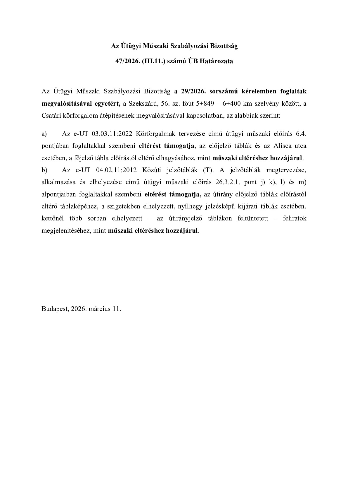 47/2026. (III.11.) ÚB határozat - Szekszárd, 56. sz. főút 5+849 – 6+400 km szelvény között, a Csatári körforgalom átépítésének megvalósítása